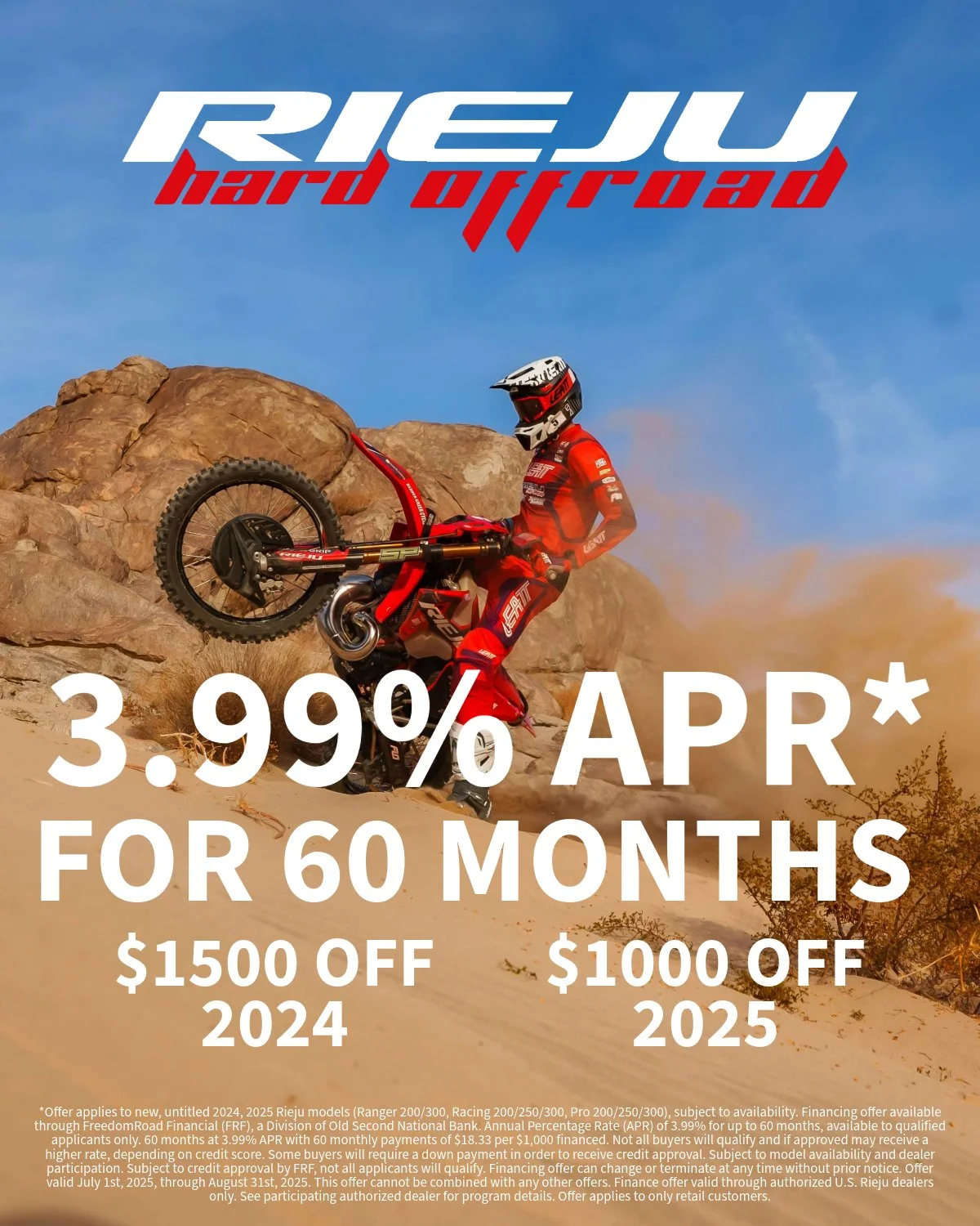 Roll into Summer with an unbeatable deal during Rieju’s Summer Sale—now through June 30th, 2025! Get a low 3.99% APR for 60 months, plus $1,500 off remaining 2024 models or $1000 off remaining 2025 models. This is your chance to hit the trails on a high-performance offroad dirtbike at an incredible price. But hurry—stock is limited and these offers won’t last long. Ride into 2025 with a powerful, European-engineered Rieju!